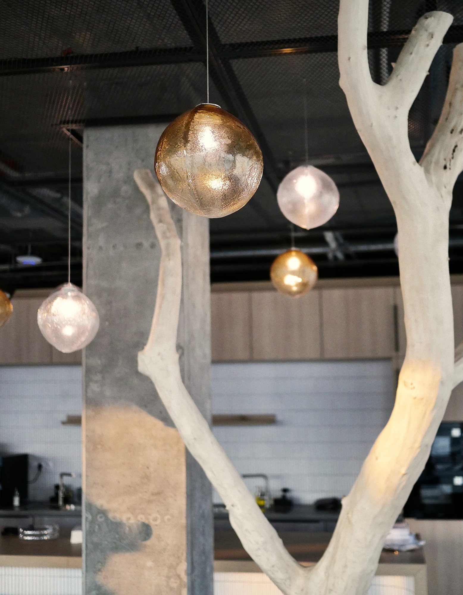 Custom Chandelier made for Phrase Offices in Prague is composed from glass textured handblown balls in two colors each suspended on its own.